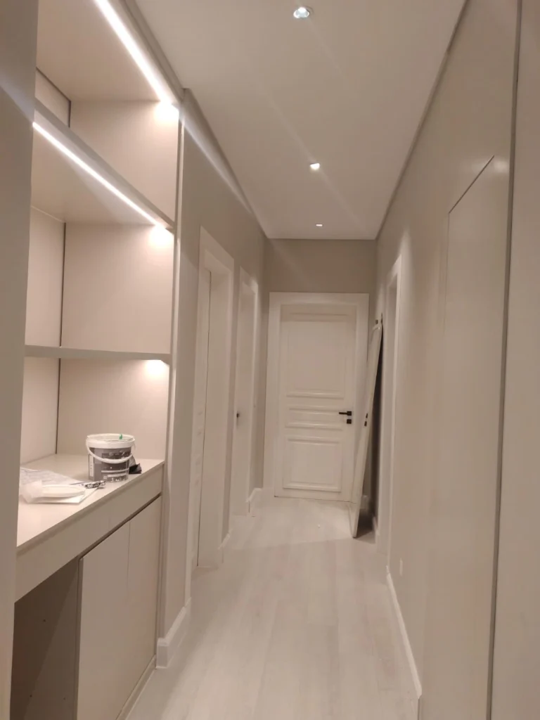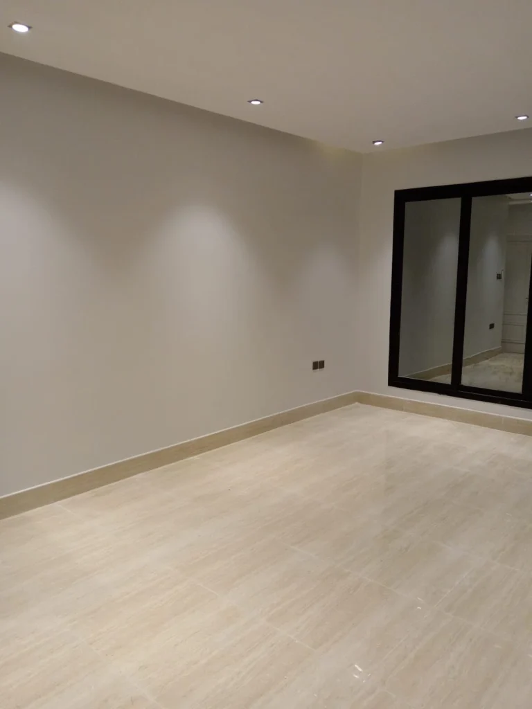 مشهد لأعمال تشطيب دهانات داخلية في منزل بالرياض، يظهر دهان الجدران بدرجة بيج دافئة
